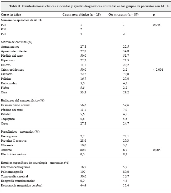 Se documentó causa neurológica del ALTE en 18 pacientes (16,8% del total); en 9 pacientes (50%) correspondió a crisis epilépticas; en 4 (22%) a trastornos neurológicos que alteran la respiración, y en 5% a sangrados del sistema nervioso central (SNC). Se compararon las características, manifestaciones clínicas y ayudas diagnósticas de los pacientes con causa neurológica respecto a otras causas (Tablas 2 y 3).