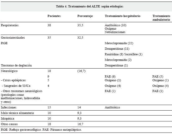Se determinó el tratamiento realizado según la etiología del ALTE (Tabla 4).