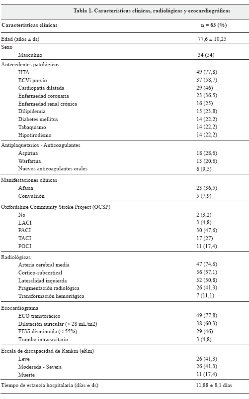De los 368 pacientes con ECV isquémica, 63 (17%) tenían diagnóstico de fibrilación auricular. Los antecedentes médicos más frecuentes fueron HTA, ECVi previo y cardiopatía dilatada. Se presentaron dos (3,2%) pacientes con AIT. En el manejo médico de la HTA, 44 (89,8%) recibían antihipertensivos y 11 (78,5%) de los pacientes con DM, hipoglicemiantes. El 58,7% recibía algún tipo de medicación antiplaquetaria o anticoagulante. Solo dos pacientes (3,2%) habían estado en tratamiento fibrinolítico al ingreso por urgencias, no hubo pacientes con intervención endovascular. Según la clasificación de OCSP, el 47,6% correspondió a infartos parciales de la circulación anterior (PACI) (Tabla 1).