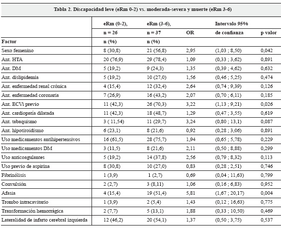 De los 63 pacientes con ECVi y FA documentamos que 41,3% presentaron desenlace favorable (eRm 0-2), 41,3% discapacidad moderada a severa (eRm 3-5) y 17,4% fallecieron intrahospitalariamente (eRm 6). En los análisis bivariado y multivariado se determinó sexo femenino (OR 3,68; IC 1,01-13,39; p = 0,048), presencia de ECVi previos (OR 3,94; IC 1,15-13,57; p = 0,030) y de afasia (OR 6,86; IC 1,7-27,66; p = 0,007), que con el evento se asociaron a mayor discapacidad y muerte (Tablas 2 y 3).