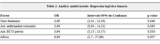 Conclusión: En esta serie el sexo femenino, antecedente de ECVi previo y afasia, son los principales factores asociados a morbimortalidad en nuestros pacientes.