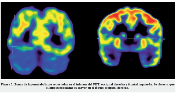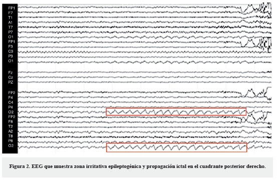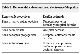 Los estudios de resonancia magnética estructural han sido negativos en la detección de posibles lesiones. El estudio de PET-CT indica disminución del metabolismo en la región occipital derecha y la región frontal izquierda sin que haya alteraciones morfológicas asociadas. La Figura 1 muestra la disminución del metabolismo en la zona occipital derecha. El videomonitoreo electroencefalográfico (VEEG) es anormal por la presencia de una zona epileptogénica estimada en el cuadrante posterior del hemisferio derecho (Tabla 1 y Figura 2).