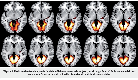Los patrones, o redes, encontrados mediante el análisis de resonancia funcional en reposo se encuentran relacionados con diferentes circuitos identificados por medio de tareas activas (18) e incluyen, entre otras, áreas visuales primarias (19) y secundarías (20). Estas redes son reproducibles entre sujetos y moduladas por las condiciones experimentales de adquisición (21, 22). Estos hallazgos, junto con investigaciones recientes (23), favorecen la hipótesis de que existe relación entre la actividad espontánea medida por BOLD y la actividad neuronal sincronizada subyacente.