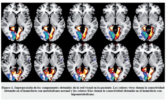 Para la paciente en mención, la red visual se divide en dos componentes (Figura 4): uno que captura la mayor parte de la actividad en el hemisferio izquierdo, colores vivos en la figura, y el segundo (con colores fríos en la figura), que captura la mayor parte de la actividad en el hemisferio derecho, en la región donde se ha detectado el hipometabolismo con PET. La figura muestra cómo la unión de estas dos redes conforman la red visual vista en controles. También se observa que la red en el hemisferio derecho tiene mayor extensión que el hipometabolismo observado en el PET (Figura 5).