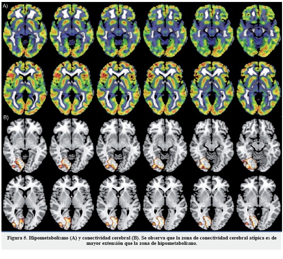 La fenomenología de las alucinaciones no tienen que reflejar de manera exacta la ubicación de la región cerebral patológica; en lugar de esto, el tipo de alucinación podría estar relacionado con un foco de actividad anormal en una red extensa de procesamiento de información (32). Eso podría explicar por qué la zona hipometabólica, región patológica, es menor en extensión que el componente independiente relacionado con la red de procesamiento visual.