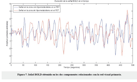 La Figura 7 muestra la señal BOLD obtenida para los segmentos derechos e izquierdo de la red visual de la paciente. Se observa que durante diferentes instantes la señal es parecida, pero es el grado de disimilaridad lo que determina que se conformen dos redes diferentes, en el caso de ICA, o que se pierda conexión entre nodos en el caso de grafos.