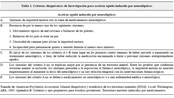 En el Manual diagnóstico y estadístico de los trastornos mentales, de la Asociación Psiquiátrica Americana (DSM-5), la acatisia aguda inducida por neurolépticos aparece incluida en la categoría de trastornos de los movimientos inducidos por medicamentos y otros efectos adversos de medicamentos (6). Se incluyen en la Tabla 1 los criterios diagnósticos de investigación para acatisia aguda inducida por neurolépticos propuestos por la Asociación Americana de Psiquiatría (APA) (7).