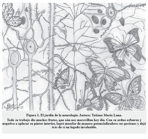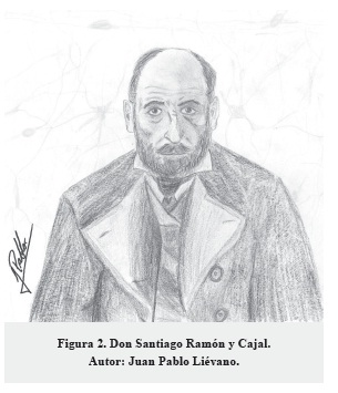 La vida de este extraordinario científico y pintor ha sido motivo de estudio por generaciones, pues fascinó la manera de poder unir armoniosamente sus pasiones. Santiago Felipe Ramón y Cajal, más conocido como don Santiago Ramón y Cajal (el "don" por un título de importancia de la época e "y" como una forma de darle renombre a sus apellidos), o referido por muchos simplemente como Cajal (por la sonoridad del apellido y la costumbre en España de utilizar el apellido materno). Nació en la provincia de Cataluña, primer hijo de la unión de Justo Ramón Casasús y Antonia Cajal Puentes. Su padre, médico del pueblo, vio en él un sucesor de la profesión, razón por la cual desde muy pequeño le exigió académicamente y le reprochó su fascinación por el arte. Su infancia fue marcada por múltiples sucesos que lo llevarían a tener un encanto por la naturaleza y querer plasmarla en sus dibujos. La influencia de su padre fue exitosa, ya que se convirtió en un prestigioso médico. Ansioso de conocer otros lugares y su sed de aventurero lo llevaron a viajar a Cuba para dar apoyo médico a las tropas españolas. A su regreso se encontró con múltiples oportunidades que forjaron su carrera como científico y le dieron solidez como persona. Se casó a la edad de 27 años con Silveria Fañanás, el motor de su vida y la madre de sus seis hijos. Su incansable curiosidad y su espíritu de pintor le permitieron describir y dibujar las células nerviosas de manera detallada, incluyendo su estructura magnífica y las relaciones de estas, comparándolas de manera muy acertada con la naturaleza, referidas por él mismo como "El jardín de la neurología". Siempre fue un paisajista romántico, que se intrigó tanto de lo macro (con sus dibujos sobre la naturaleza y la anatomía), como de lo micro (la histología) (Figura 1).