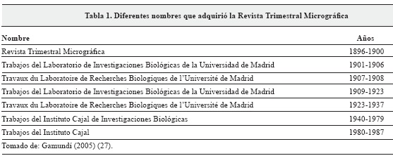 Cajal, además de publicar en varias revistas internacionales, editó una revista de publicación trimestral que él financiaba: la Revista Trimestral Micrográfica, la cual cambió de nombre e idioma varias veces a lo largo de su historia (Tabla 1). Fue invitado de honor a múltiples eventos nacionales e internacionales y empezó a recibir honores, entre ellos, el Doctorado Honoris Causa en Ciencias, de la Universidad de Cambridge, en 1894, y en Medicina de la Universidad de La Clark (Worcester, Massachusetts, Estados Unidos), en 1899, entre otras importantes distinciones (2).