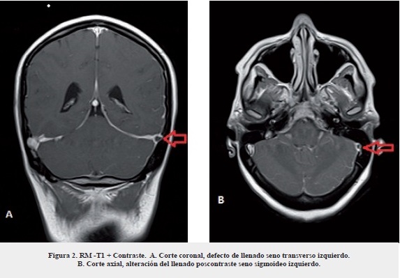Para el diagnóstico de TSVC se debe partir de una minuciosa evaluación clínica y sospechar cuando se está ante la presencia de síntomas como cefalea, vómito o nauseas, signos de hipertensión endocraneana, papiledema, estados de hipercoagulabilidad, embarazo, puerperio o utilización de anticonceptivos hormonales19. En el caso de las ayudas diagnósticas, la utilización de la resonancia magnética nuclear permite ver con mayor facilidad la oclusión del seno venoso20.