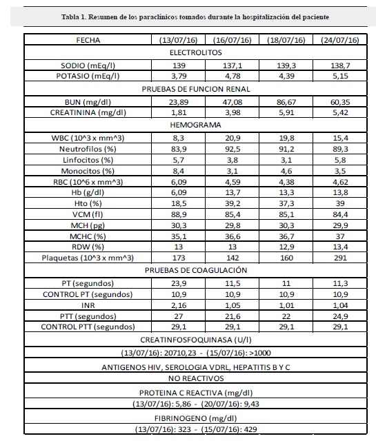 Paciente de 54 años de edad de sexo masculino procedente del municipio de Paicol, Huila, de ocupación ganadero. Consultó al hospital de primer nivel de atención del municipio en mención por presentar cuadro clínico de 12 horas de evolución, caracterizado por mordedura de serpiente "cascabel" en el dorso de su mano derecha con posterior dolor intenso y edema progresivo de la extremidad afectada, por lo que consulta a dicho centro. En su atención inicial recibió manejo sintomático y fue remitido a segundo nivel de complejidad para manejo especifico. Es allí donde suministran 6 ampollas de suero antiofídico polivalente; sin embargo, durante la estancia presentó deterioro respiratorio progresivo con criterios de falla ventilatoria lo que obligó a inicio de soporte ventilatorio mecánico invasiva y referencia a nuestra institución para manejo en unidad de cuidado intensivo. Al examen físico de ingreso se encontraba en estado de sedación por intubación con los siguientes hallazgos notados como positivos o anormales: las pupilas eran isocóricas e hiporeactivas, en su extremidad superior derecha presentaba lesiones puntiformes de predominio en el dorso de la mano con edema moderado; no había presencia de necrosis, flictenas u otras lesiones de consideración. Además, en su catéter vesical se documentó orina hematuria. Sus paraclínicos de ingreso mostraron compromiso miopatico severo, con elevación marcada de creatin quinasa total y elevación de azoados. Sus gases arteriales de revelaron acidosis metabólica e hiperlactatemia. Durante el seguimiento presentó evolución tórpida, aunado a aumento progresivo de azoados y oligo-anuria, que obligó a inicio de terapia de reemplazo renal. En la tabla 1 se muestra la evolución paraclínica del paciente.