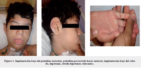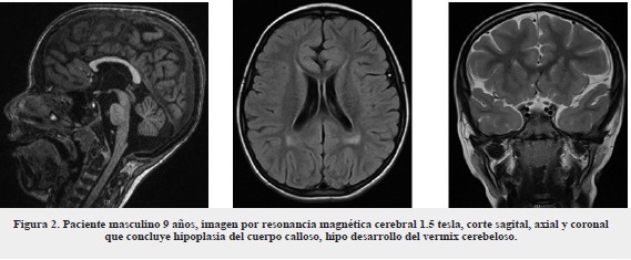 Paciente masculino de 9 años, con diagnóstico de epilepsia generalizada de inicio a los 5 años, refractaria a manejo farmacológico, con parálisis cerebral espástica y retraso neuromadurativo global. Antecedentes personales de infecciones respiratorias recurrentes, requirió hospitalización y manejo. Al examen físico con medidas antropométricas: talla 138 cm - peso 24 kg - PC 53 M - IMC 13 kg/M2. Fenotipo (figura 1) con paladar ojival, mallampathy III, implantación auricular baja, pabellón auricular proyectado hacia adelante, implantación baja del cabello, hipoplasia malar bilateral, escapulas aladas, genu varo, pie plano. Se realizaron paraclínicos (tabla 1) y resonancia magnética nuclear 1.5 tesla (figura 2), en la que se reporta hipoplasia del cuerpo calloso, hipodesarrollo del vermis cerebeloso.