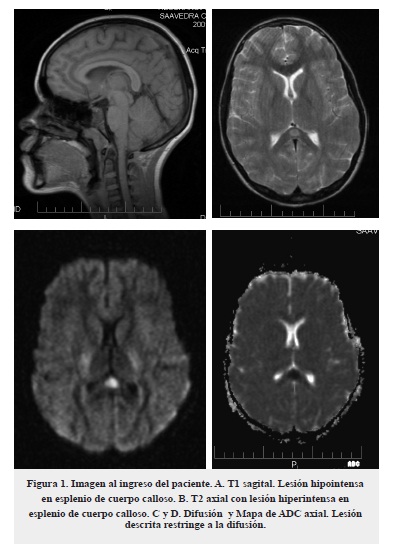 Paciente femenina de 11 años, quien consultó al servicio de urgencias por un cuadro de 3 días de evolución, inició con cefalea pulsátil frontal que empeoró progresivamente y posteriormente se acompañó de disartria, dificultad en la marcha con aumento del polígono de sustentación, fiebre cuantificada y somnolencia. No presentaba antecedentes médicos de importancia. Al examen físico de ingreso a urgencias se encontró un puntaje en la escala Glasgow de 10/15 (ocular 3, verbal 2, motor 5) con pobre seguimiento de instrucciones, escasa movilización espontánea de miembros superiores, todos los reflejos normales y sin signos meníngeos. Se consideró inicialmente como primera posibilidad diagnostica encefalitis y se iniciaron estudios, incluyendo una RMN cerebral simple y con contraste que mostró una lesión única en esplenio de cuerpo calloso hipointensa en T1 e hiperintensa en T2 y FLAIR, que restringe a la difusión en mapa de ADC, sin realce con el medio de contraste (figura 1). Se tomó estudio de líquido cefalorraquídeo (LCR) que mostró pleocitosis (184 células x mm3) linfocitaria (60 %), hiperproteinorraquia (125 mg/dL), lactato ligeramente elevado (3 mmol/L), con el resto de parámetros dentro de los rangos normales. El cultivo bacteriano y la reacción en cadena de la polimerasa (PCR) para Herpes I y II fueron negativos. Se completaron estudios con búsqueda de causas autoinmunes para lo cual se solicitaron: anticitoplasma de neutrófilo, complemento (C3 y C4), complemento CH50, anticardiolipinas IGG e IGM, anticuerpos anti ADN de doble cadena, Anti Ro y Anti Smith que estuvieron dentro de rangos normales. Se amplió estudio imagenológico con RMN de columna simple y contrastada, la cual no presentó lesiones.