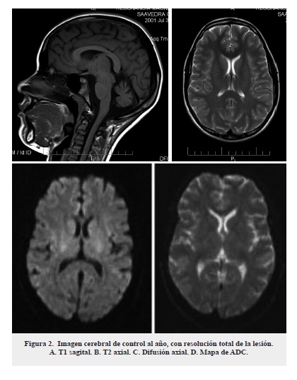 Se administró tratamiento con aciclovir por 14 días e inmunoglobulina a dosis total de 2 gr/kg dividida en dos dosis. Se realizó una punción lumbar de control al tercer día con disminución de parámetros inflamatorios. En la evolución clínica se encontró resolución total de los síntomas a las 4 semanas, con RMN cerebral de control al mes y al año del inicio del cuadro dentro de límites normales (figura 2).