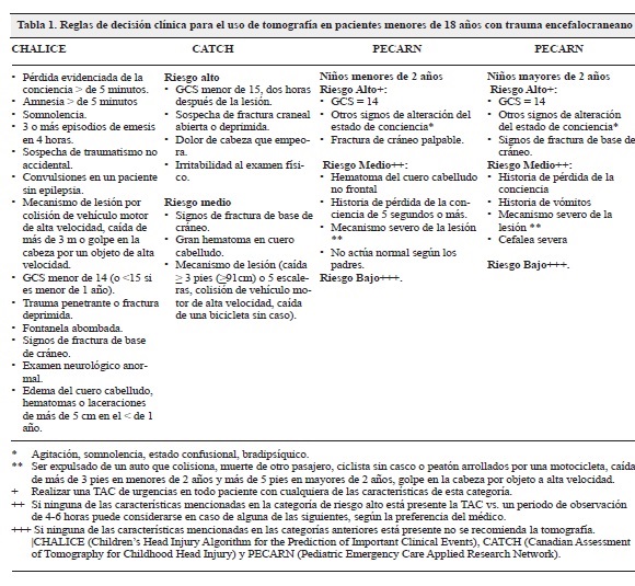 Las reglas de decisión clínica del CATCH fueron creadas por el Pediatric Emergency Research Canada Head Injury Study Group y publicadas en 2010. Su objetivo es determinar niños menores de 16 años con trauma craneoencefálico leve (historia de pérdida del estado de conciencia, amnesia o desorientación, más de un episodio de emesis o irritabilidad persistente en menores de 2 años en un paciente con un puntaje por GCS de 13 a 15) dentro de las 24 horas de la presentación del mismo que requieren intervención neurológica. Estas resultaron 100 % sensibles y 70 % específicas en la determinación de necesidad de intervención quirúrgica en el grupo de "alto riesgo", y fue 98 % sensible y 50 % específica para la identificación de lesiones cerebrales en la TAC en el grupo de riesgo medio20,45,46. Consideran realización de TAC en todo niño con trauma craneoencefálico leve y cualquiera de los hallazgos que se mencionan en la tabla 1.