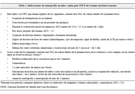 En la tabla 2, se muestran las indicaciones de TAC en niños sugeridas en esta guía.