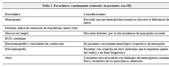 Si se usa la clasificación internacional de alteraciones del sueño (ICDS-3) se agrega como criterio de soporte que los síntomas deben causar malestar, o dificultad para conciliar el sueño, para diagnosticar SPI22. Es importante resaltar que el diagnóstico del SPI es clínico, la polisomnografía se debe realizar sólo en pacientes en los que haya duda diagnóstica, y otros paraclínicos como la ferrocinética y las pruebas renales se realizan para descartar las formas secundarias.