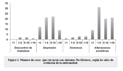 Los cambios cognitivos también fueron evaluados a través del MMSE y confirmados con valoración neu-ropsicológica. Fueron pocos los casos que cursaron con esta entidad. Se documentaron cambios demenciales en 3 pacientes de más de 10 años de evolución de la enfermedad, en otros 3 pacientes de más de 5 años de evolución de la enfermedad, y en 2 pacientes que se encontraban en los primeros 5 años de evolución de la enfermedad. Ningún paciente de menos de 1 año de evolución de la enfermedad de Parkinson cursó con trastorno del control de impulsos. De un total de 5 pacientes que cursaron con este trastorno, 2 pacientes se encontraban en los primeros 5 años de la enfermedad, otros 2 pacientes se encontraban en los primeros 10 años, y 1 pacientes tenía mas de 10 años de evolución de esta entidad. Las alteraciones en el estado de ánimo también fueron evaluadas. Veintiún pacientes en los primeros 5 años, 22 pacientes en los primeros 10 años, y 9 pacientes de más de 10 años cursaron con síntomas de trastorno depresivo mayor. Figura 2.