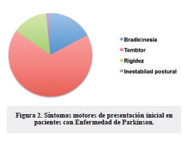 Síntomas motores de la enfermedad: los síntomas motores referidos por el paciente como síntoma inicial de la enfermedad fueron: temblor (62.3 %), bradicinesia (15.9 %), rigidez (12.6 %), dificultad para caminar (8.1 %), alteración del equilibrio (1.6 %) y caídas (1.6 %). Figura 1.