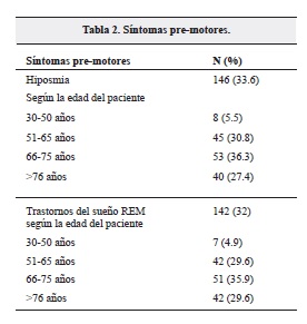 Síntomas pre-motores de la enfermedad: dentro de los síntomas pre-motores hallados se documentó hiposmia y trastornos del sueño REM en un 33.6 y 32 % respectivamente, Tabla 2. Cuando se analizó la presencia de estos síntomas según la edad, se observó que los pacientes jóvenes son los que menos la manifiestan, a diferencia de aquellos de 66 a 75 años en los que un 36.3 % refirieron hiposmia, y un 35.9 % trastornos del sueño REM. Tabla 2. Síntomas pre-motores en pacientes con enfermedad de Parkinson.