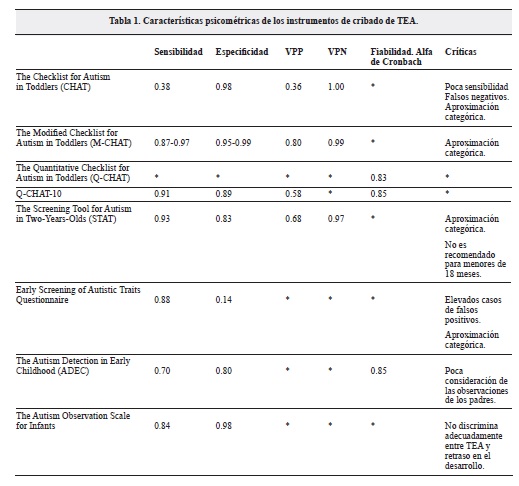 Stone et al.89, refieren que uno de los desafíos más grandes para los investigadores del autismo ha sido traducir el conocimiento empírico producto de las investigaciones sobre signos tempranos de TEA, en aplicaciones clínicas que permitan identificar factores de riesgo de TEA en edades tempranas. Así se han desarrollado diferentes medidas de cribado de TEA para ser aplicadas a la población general y en contextos pediátricos (tabla 1). Entre los principales instrumentos de cribado de TEA se encuentra The Checklist for Autism in Toddlers (CHAT), traducido al español como Lista de verificación para la detección del autismo en niños pequeños84. Es una herramienta breve diseñada para ser aplicada en el sistema de salud de atención primaria con el fin de identificar a niños de 18 meses de edad con riesgo de TEA. Baron-Cohen et al.90 usaron el CHAT en 16.235 niños de 18 meses de edad durante un chequeo de rutina de desarrollo. Doce niños fueron identificados con riesgo de TEA, diez de los cuales recibieron el diagnóstico de TEA y dos recibieron un diagnóstico de retraso en el desarrollo; los diagnósticos se mantuvieron estables durante 3.5 años, con una tasa de falsos positivos del 16.6 %. En un estudio de seguimiento a largo plazo de esta misma población, se encontró que aunque el CHAT tenía una excelente especificidad (0.98), carecía de sensibilidad (0.38), ya que 50 niños adicionales se identificaron con TEA a la edad de 7 años y ninguno de ellos había sido identificado como "en riesgo" a los 18 meses. La baja sensibilidad del CHAT reduce su uso como instrumento de cribado, ya que un gran porcentaje de los niños con TEA (aproximadamente el 60 %) no se identificó por el CHAT a los 18 meses91.