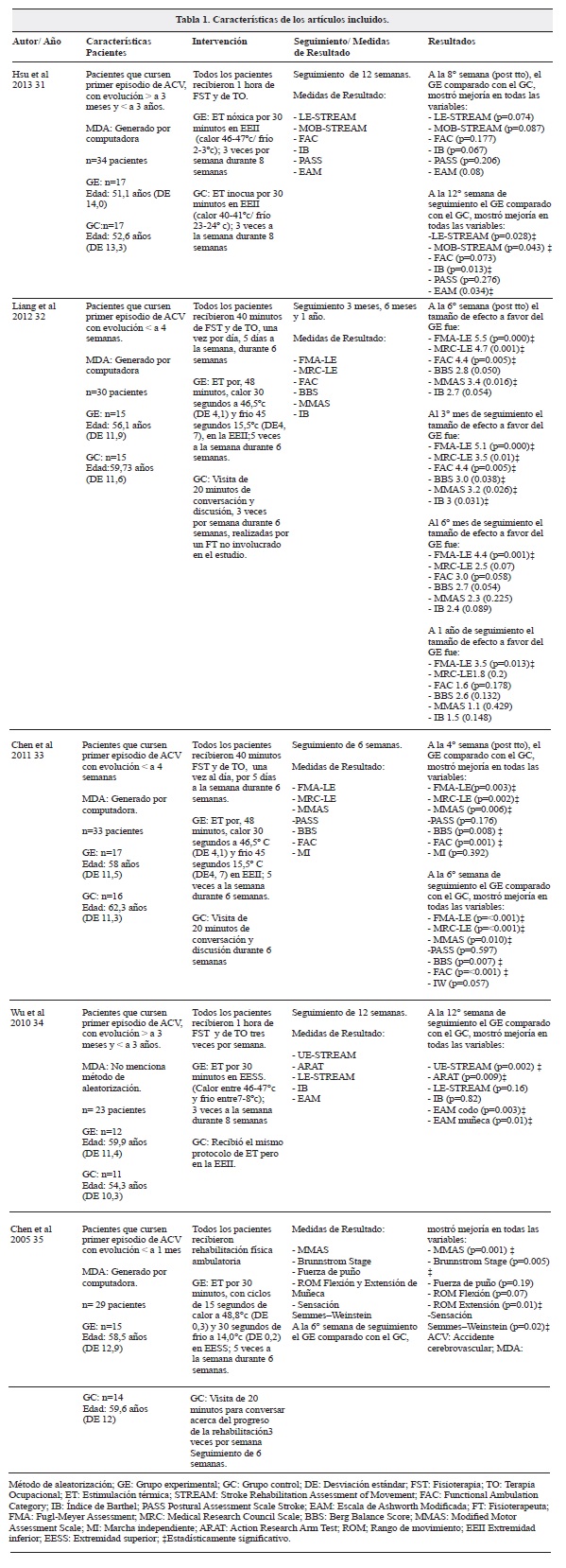 Se intentó determinar si existe evidencia científica que avale la efectividad de la ET en la recuperación de la función motora, cuando se adiciona a un tratamiento de rehabilitación física en pacientes adultos post ACV, se seleccionaron 5 ECAs que cumplían con nuestros criterios de elegibilidad, los protocolos de ET ocupados presentaban algunas diferencias, en cuanto a la periodicidad; 3 estudios lo aplicaron 5 veces a la semana durante 6 semanas32,33,35, y los dos restantes 3 veces a la semana durante 8 semanas31,34. En cuanto a la dosis; 2 de los estudios seleccionados lo aplicaron durante 48 minutos32,33, mientras que el resto lo aplicó por 30 minutos31,34,35. Los rangos de temperatura fluctuaban entre los 48 °C de calor y 2 °C de frío, 3 estudios aplicaron el calor durante 15 segundos31,34,35, los dos restantes lo aplicaron 30 segundos32,33, 3 estudios aplicaron el frío durante 30 segundos31,34,35, los dos restantes lo aplicaron 45 segundos32,33, los ciclos de alternancia térmica se repetían 8 a 10 veces con 30 segundos de reposo entre cada uno.