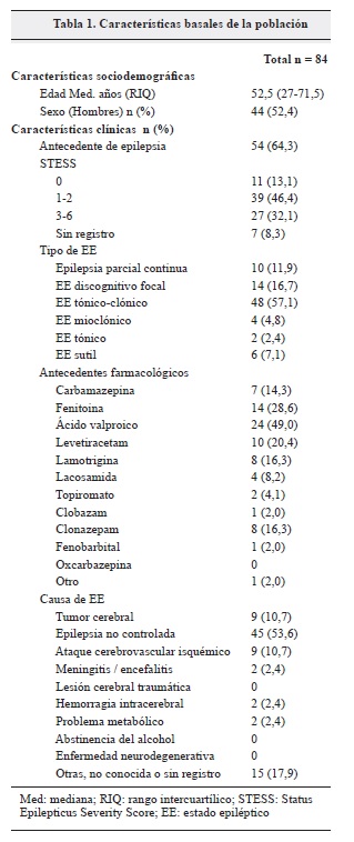 Resultados: se incluyeron 84 casos, con una mediana de edad de 52,5 años rango intercuartílico (RIQ 27-71,5); el 64,3% de los pacientes (n=54) tenían antecedentes de epilepsia. El tipo de estado epiléptico más frecuente fue tónico-clónico en el 57,1% (n=48) y la causa principal epilepsia no controlada en el 53,6% (n=46). Para el manejo de primera línea, la mitad de los pacientes recibieron combinaciones de benzodiazepinas con otro anticonvulsivante, los más usados fueron fenitoina y ácido valproico. Todos los fármacos antiepilépticos de primera línea se administraron por vía endovenosa. En 32 pacientes (38,1%) se requirió el manejo en la unidad de cuidados intensivos. El resultado, muerte de 17 pacientes (20,2%) y secuelas neurológicas sin muerte en 6 pacientes (7,2%).