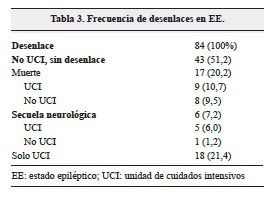 En cuanto a los desenlaces, 17 pacientes (20,2%) fallecieron y 6 (9,0%) tuvieron secuelas neurológicas sin muerte, en 4 pacientes se presentó un déficit motor y en un paciente síndrome extrapiramidal; el paciente restante se tomó como secuela del EE dado que no volvió a su estado basal y al ser remitido a otra institución, no fue posible conocer su desenlace final. La tabla 3 muestra la frecuencia de desenlaces en el EE.