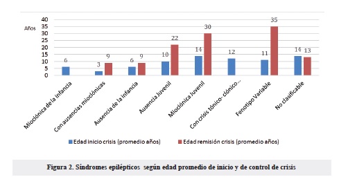 Al evaluar de manera aislada cada síndrome, se documentó que su debut puede ocurrir de manera temprana, como sucede con la epilepsia de ausencia infantil, detectada desde los 2 años de edad, ausencia juvenil desde los 5 años y mioclónica juvenil desde los 9 años con límite superior en 10, 20 y 19 años respectivamente (Tabla 1). Con respecto a la edad promedio de control de crisis quienes más rápido lo obtuvieron fueron los pacientes con epilepsia de ausencias mioclónicas (9 años) y epilepsia de ausencia infantil (9 años), mientras que los que más tardaron en lograr este resultados fueron aquellos que presentaron diagnóstico de fenotipo variable (35 años) (Figura 2).