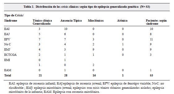 En cuanto a los tipos de crisis clínicas, se evidenció que aquellos con epilepsia de ausencia infantil (n=10) y de ausencia juvenil (n=8) desarrollaron dos patrones: ausencia típica en 100% y 70% de los casos, seguido por crisis tónico clónica generalizada en 30% y 63% de los pacientes respectivamente. La mayor diversidad de crisis clínica se estableció en la epilepsia de fenotipo variable y la epilepsia no clasificable. En el grupo de fenotipo variable (n=11) se evidenció: crisis tónico clónica generalizada y ausencia típica en el 64% en ambas categorías, mioclónicas (27%) y ausencia atípica en un paciente (13%). Con respecto a la epilepsia no clasificable (n=9) se evidenciaron los siguientes tipos de crisis: tónico clónica generalizada (33%), ausencia típica (44%), mioclónicas (22%) y atónica en un paciente (11%). En la epilepsia mioclónica juvenil se observó que los pacientes han presentado 3 tipos de crisis; tónico clónica generalizada (44%), ausencias típicas (33%) y mioclonías (100%) (Tabla 2).