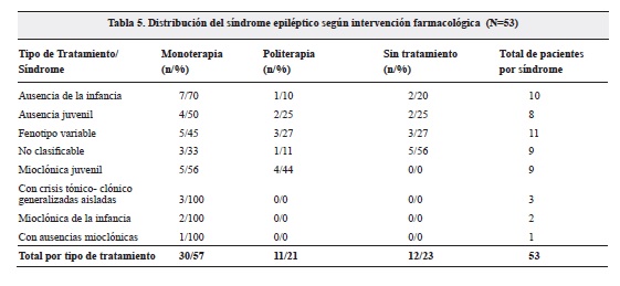 Según el tipo de síndrome epiléptico, en las ausencias infantiles se consiguió el control de crisis en el (n=10), 70% de los casos, un 20% no recibía tratamiento farmacológico y el 10% no lo obtuvo a pesar de la medicación. En la epilepsia de fenotipo variable (n=11) el 36% tuvo control de las crisis, 36% no se controlaron y un 27% no recibió tratamiento farmacológico. En la epilepsia mioclónica juvenil (n=9), el 44% consiguió un control de las crisis. Para el caso de la epilepsia de ausencias juveniles (n=8) se encontró 37.5% de control de las crisis, 37.5% no tuvieron control de las crisis y el 25% no recibían tratamiento farmacológico. La frecuencia del control de crisis en los restantes grupos de síndromes epilépticos se describe en la Tabla 4.