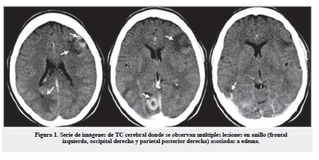 Al séptimo día del ingreso comenzó con crisis focales simples mioclónicas que involucraron el miembro superior derecho, lo que motivó una interconsulta con neurología. En el examen físico neurológico no se constataron signos focales ni papiledema. Se decidió realizar una TC cerebral donde se observaron múltiples lesiones en anillo (frontal izquierda, occipital derecha y parietal posterior derecha) asociadas a edema, que no desplazaron las estructuras de la línea media ni produjeron herniaciones, las cuales captaron poco contraste en la periferia en estudio de TC contrastada (Figura 1). Las características imagenológicas de estas lesiones ofrecían la duda diagnóstica entre una infiltración al sistema nervioso central por su enfermedad de base o múltiples abscesos cerebrales.