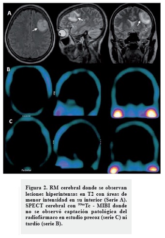 Decidimos realizar una SPECT cerebral con 99mTc - MIBI donde no se observó captación patológica del radiofármaco en el estudio precoz el ni tardío (Figuras 2, serie B y C). Ante la negatividad de este estudio, diagnosticamos que las lesiones evidenciadas en TC y RM de cráneo correspondían a abscesos cerebrales. La paciente fue tratada con antimicrobianos de amplio espectro y en estudio evolutivo a los 20 días -RM cerebral-, se observó una gran mejoría de las lesiones encefálicas (Figura 3).