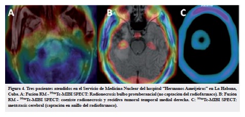 El 99mTc-MIBI es sensible para el diagnóstico de gliomas cerebrales y puede discriminar entre lesiones las encefálicas malignas y las benignas con efectividad (13, 14). Además es capaz de diferenciar áreas de recurrencia tumoral y radionecrosis (15, 16) (Figura 4)