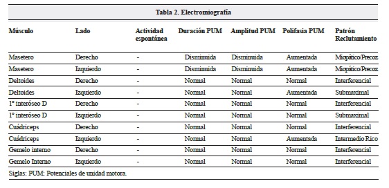 Todos los resultados fueron normales. Se llevó a cabo un estudio vídeo-endoscópico, se evidenció un trastorno de la deglución. Se realizó un completo estudio de conducción nerviosa en el que se valoró la conducción de ambos nervios medianos, cubitales, peroneales profundos, tibiales (con ondas F) y surales así como una estimulación repetitiva del nervio mediano derecho en condiciones basales, tras 1 minuto de contracción mantenida del músculo separador corto del pulgar derecho y tras 4 minutos de isquemia de la extremidad superior derecha. Se amplió el estudio realizando una estimulación repetitiva del nervio facial izquierdo ("Tabla 1). Por otro lado, se valoró la actividad electromiográfica de los músculos maseteros, deltoides, primeros interóseos dorsales, cuádriceps y gemelos internos de ambos lados. La paciente presentó una estatura de 1,65 metros y las mediciones se realizaron a una temperatura ambiental de 22ºC. El estudio neurofisiológico evidenció unos hallazgos en la conducción nerviosa y en la estimulación repetitiva normales, siendo patológicos los hallazgos electromiográficos (Tabla 2, Figura 1).