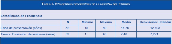 Resultados. La razón según sexo fue 1.5:1 a favor de las mujeres. La edad osciló entre 18 y 69 años, con un promedio de 44,7 años (DS ± 12,193), con un grupo etario prevalente entre 41 y 69 años. En el estudio 41 de 52 pacientes (78.8%) tenían síntomas sugestivos de la enfermedad, pero al revisar y aplicar los criterios radiológicos sólo se encontró que los cumplían 30/52 (57%) y del total de pacientes seguidos en concordancia con criterios de McDonald-2010 se validaron 33/52 (63.4%).