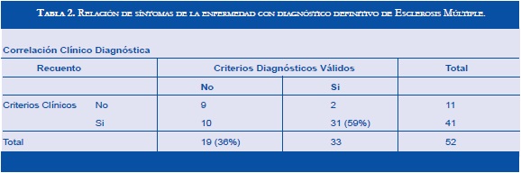 Objective. To improve the quality of the diagnostic and therapeutic process of MS patients determining compliance of clinical and imaging criteria of MS and compare the initial diagnosis with the end results of 52 patients diagnosed with MS who were evaluated between April 2010 and November 2011 at the outpatient clinic "Neurologos de Occidente" in Cali-Colombia.