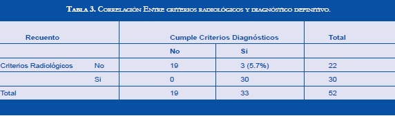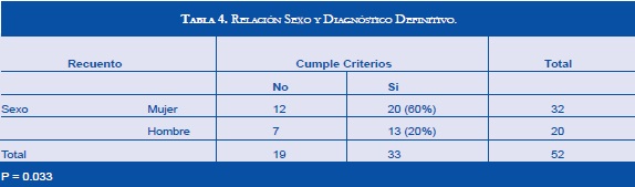 Se encontró que de los pacientes del estudio, 41/52 (78.8%) (Tabla 2) presentaron síntomas sugestivos de la enfermedad, estos incluyeron ataques con secuelas de discapacidad por lesiones desmielinizantes de la sustancia blanca. Así mismo, al revisar los criterios radiológicos sólo se hallaron 30 de 52 (57%) (Tabla 3), que cumplían con este criterio esencial que para la corroboración diagnóstica; se evidenciaron como falsos positivos áreas de hiperintensidad inespecíficas en secuencia T2 y Flair, que no se localizaban en las lugares característicos o típicos para esta enfermedad, a las que se les dio puntaje de 0 así como a quienes tenían resonancias magnéticas (RM) cerebral y medular normales, sin embargo 3/52 (5.7%) pacientes tuvieron hallazgos radiológicos patológicos no concluyentes, y en reuniones académicas se validó el diagnóstico por los síntomas relacionados y otros estudios paraclínicos. Fue evidente la mayor prevalencia del diagnóstico en el sexo femenino (Tabla 4) y hubo diferencia estadísticamente significativa con relación a los hombres de 1:1.5 hombre/mujer.