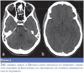 Debido al cambio agudo del estado de conciencia y los hallazgos sugestivos de lesión en el tallo cerebral, se practicó de forma urgente tomografía simple de cráneo la cual demostró signos leves de edema cerebral y escasas hipodensidades en el hemisferio cerebeloso izquierdo (Figura 1). Además, se efectuó hemograma que evidenció leucocitosis con neutrofilia, sin anemia ni trombocitopenia y química sanguínea dentro de parámetros normales. Con la sospecha clínica de romboencefalitis infecciosa se inició cubrimiento antimicrobiano con ceftriaxona, ampicilina, aciclovir y dexametasona. Posteriormente, se realizó punción lumbar y se encontró presión de apertura de 6 cmH20 con citoquímico normal (leucocitos 0, Proteínas: 33 Glucorraquia 63/93) con coloración Gram y antígenos bacterianos negativos, y días posteriores al procedimiento se obtuvieron los resultados del cultivo y la PCR para los virus de la familia del Herpes todos negativos.