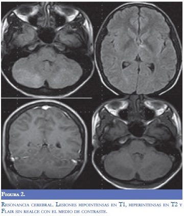 Por el deterioro progresivo y el compromiso predominantemente de la fosa posterior, se consideraron como diagnósticos diferenciales trombosis venosa cerebral profunda o encefalitis de tallo. La resonancia magnética cerebral practicada seis horas después del deterioro neurológico, (Figura 2) evidenció lesiones hiperintensas en T2 e hipointensas en T1 en ambos lóbulos cerebelosos, tallo cerebral, corteza calcarina y región talámica izquierda. Algunas de estas lesiones realzaron con el medio de contraste, pero no hubo realce meníngeo. La angiorresonancia y la venografía por resonancia no mostraron alteraciones.