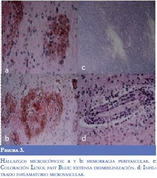 El estudio anatomopatológico (Figura 3), demostró hemorragia perivascular con extravasación de glóbulos rojos e infiltrado inflamatorio microvascular, sin compromiso infeccioso. En la coloración de Luxol Fast Blue se observó desmielinización perivascular extensa compatible con Leucoencefalitis Hemorrágica Aguda.