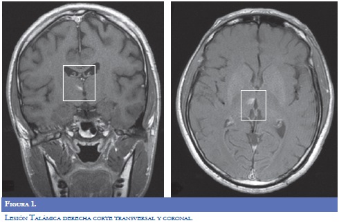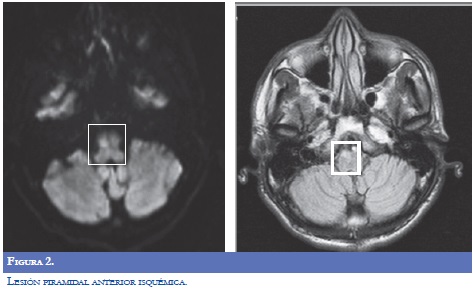 Paraclínicos de ingreso: glucometría 272 mg/ dl, Hb Glicosilada 15,8%. La RM del encéfalo (9/09/2009): evidenció lesión que restringía la difusión, visible en FLAIR y T2, infarto subagudo en región superior y anterior derecha del bulbo raquídeo. Imagen hiperintensa en T1, que no realzaba, en el tálamo derecho. Angioresonancia: fenestración de la arteria vertebral derecha distal, hallazgo incidental Neuroradiología reportó que la lesión hiperintensa talámica derecha pudiera obedecer a alteración metabólica por hiperglicemia, pero fue asumido por neurología clínica como infarto lacunar (Figuras 1-2).