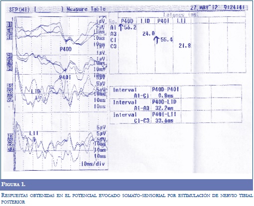 Potenciales evocados somatosensoriales por estimulación de nervio tibial posterior: mostró marcada prolongación bilateral de las ondas P40, así como del tiempo de conducción central, con respuestas lumbares normales; lo cual indicó marcado trastorno de la conducción mediada por fibras mielinizadas gruesas del sistema dorsalemniscal entre la cola de caballo y la corteza somatosensorial bilateral (Figura 1).