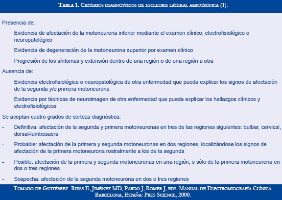 Existen varios criterios para el diagnóstico de esta afección, pero los más difundidos y utilizados son los de El Escorial (Tabla 1) (2,3); aunque se trabaja para mejorar su sensibilidad y especificidad. Entre los exámenes complementarios de mayor utilidad se encuentran los estudios de electrofisiológico y las imágenes de resonancia magnética (1,2,4).