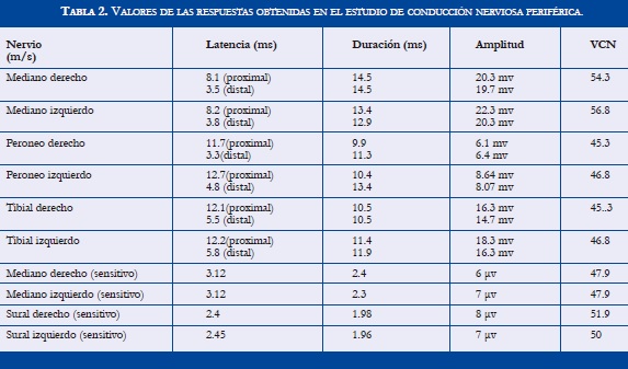 Estudio de conducción nerviosa periférica: los ECN motora de los nervios medianos y peroneos profundos, así como sensitiva de medianos y surales bilaterales fueron normales. El estudio de conducción nerviosa sensitiva mostró signos ligeros de compromiso mielínico de las fibras de ambos nervios medianos (Tabla 2).