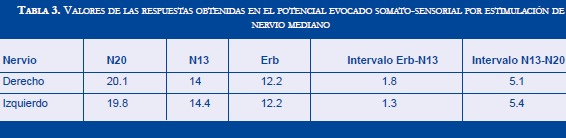Potenciales evocados somatosensoriales por estimulación de nervio mediano: se obtuvieron respuestas bilaterales dentro de límites normales (Tabla 3).