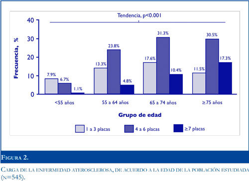 La ECA moderada-severa sintomática se encontró en el 6%. Se encontró una asociación directa entre la edad y la ECA, de tal forma que a mayor edad, mayor prevalencia de esta condición (Figura 1).