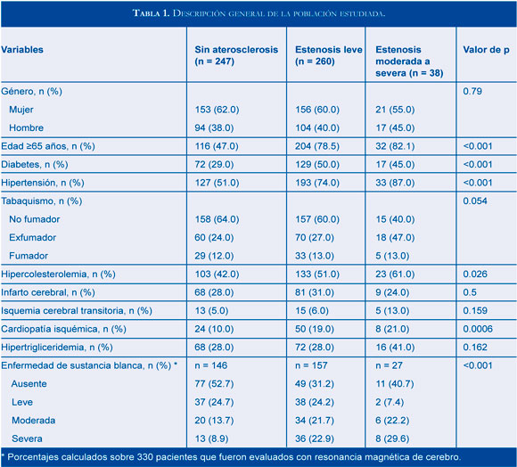 Se realizó un estudio retrospectivo y descriptivo sobre pacientes que recibieron exploración ultrasonográfica de carótidas entre enero de 2009 y diciembre de 2010 en el Instituto Nacional de Ciencias Médicas y Nutrición "Salvador Zubirán", de la Ciudad de México. El comité de ética local de nuestro Instituto aprobó el presente análisis. Se revisaron los expedientes clínicos de 545 pacientes a quienes se les realizó ultrasonido Dóppler de las arterias carótidas, por distintas indicaciones. Se obtuvieron datos clínicos y de laboratorio en todos los casos y en un subgrupo de pacientes se contó con resonancia magnética cerebral, evaluando la presencia de enfermedad de sustancia blanca asociada. Para clasificar la ECA de acuerdo a su severidad, se tuvieron en cuenta los siguientes criterios: