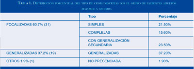 Entre el 50 y 70% de los pacientes presentan crisis parciales en su mayoría complejas (11), las generalizadas que se observan corresponden usualmente a crisis parciales secundariamente generalizadas, mientras que las epilepsias generalizadas idiopáticas de comienzo tardío son raras después de los 60 años. Las primariamente generalizadas suelen ocurrir como consecuencia de encefalopatías pos anóxicas o procesos neurodegenerativos (11,12).