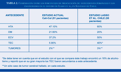 El 47.1% de los pacientes tuvieron antecedente de hipertensión arterial y en el 29,4% hubo historia de uno o varios ECV previos, el 23,5% presentaron algún tipo de cardiopatía o coronariopatía, el 21,6%, fueron diabéticos y el 5,9% hipotiroideos, dislipidémi-cos, o con deterioro cognoscitivo comprobado e igual porcentaje con trauma craneoencefálico (Figura 1).